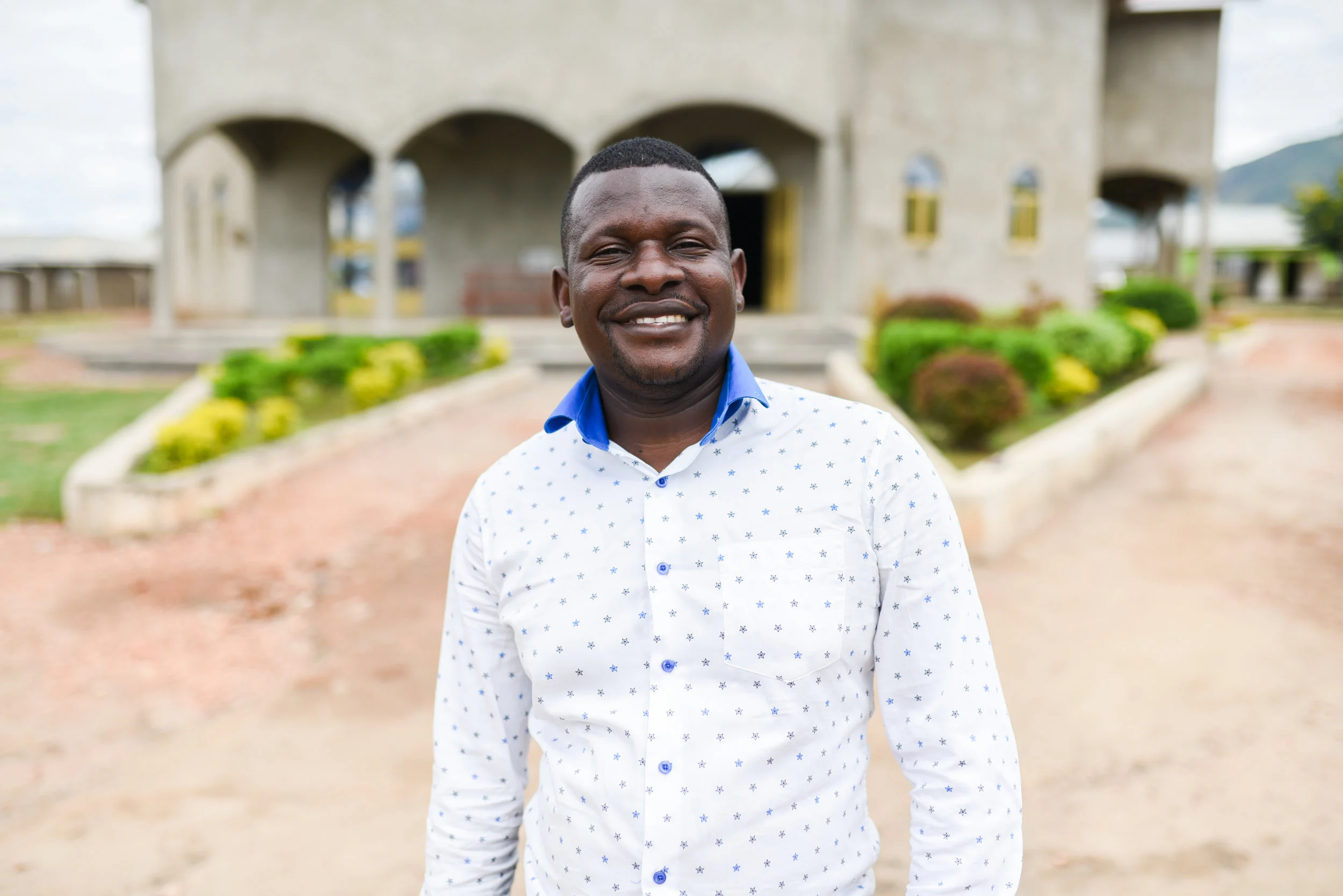 Pastor Moses in front of the church and the school in Kasese, Uganda. May 2019.